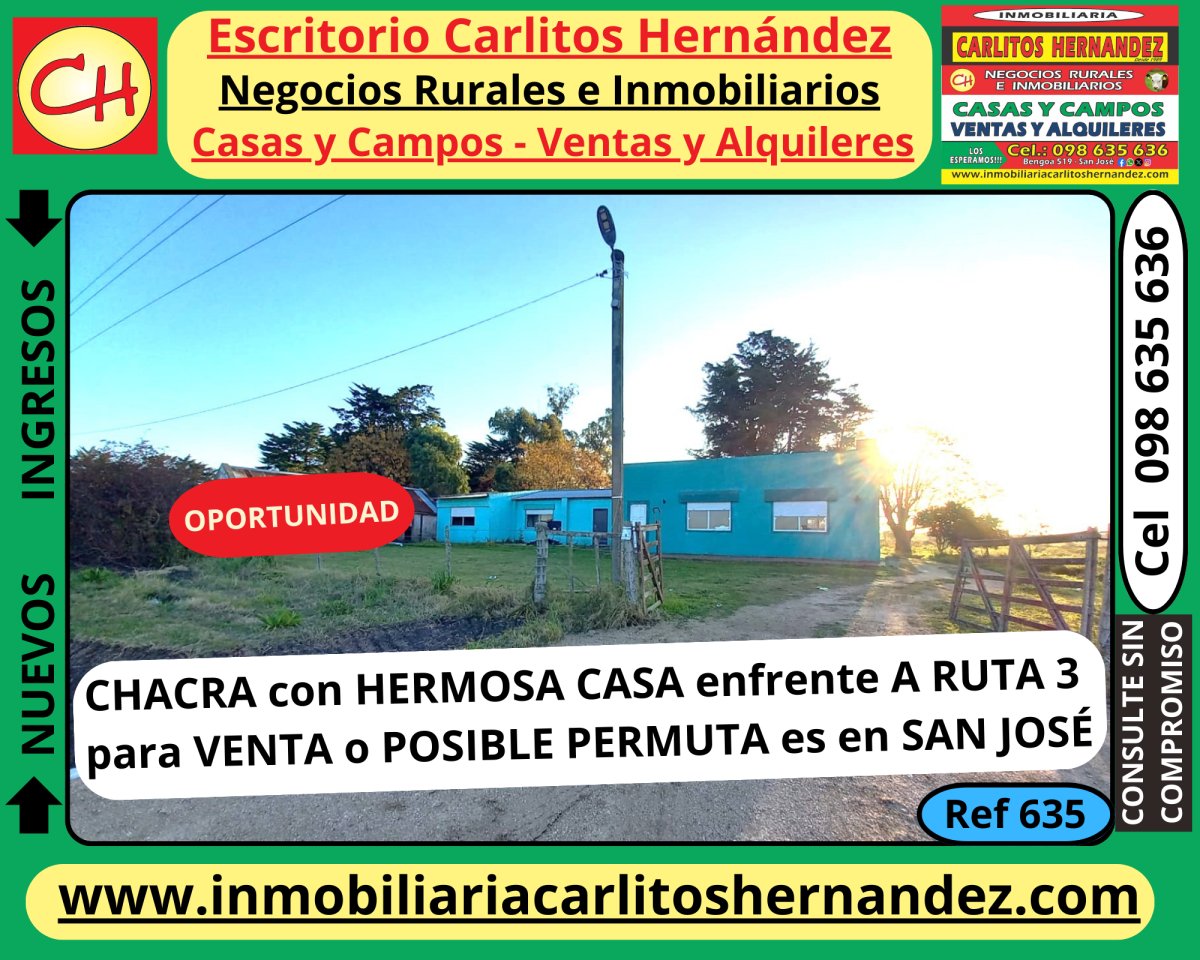 Ref 635) V - 🌳🌳CHACRA de UNAS 3 HAS con 🏠🏠 HERMOSA CASA, es BIEN ENFRENTE A LA RUTA 3, ZONA de CAÑADA GRANDE en el DEPARTAMENTO de SAN JOSÉ, es para la VENTA 💲 💲 y PUEDE 👉👉 ESTAR LA POSIBILIDAD de TOMAR ACA EN SAN JOSÉ una CASA de MENOS VALOR como PARTE de PAGO 💲 💲