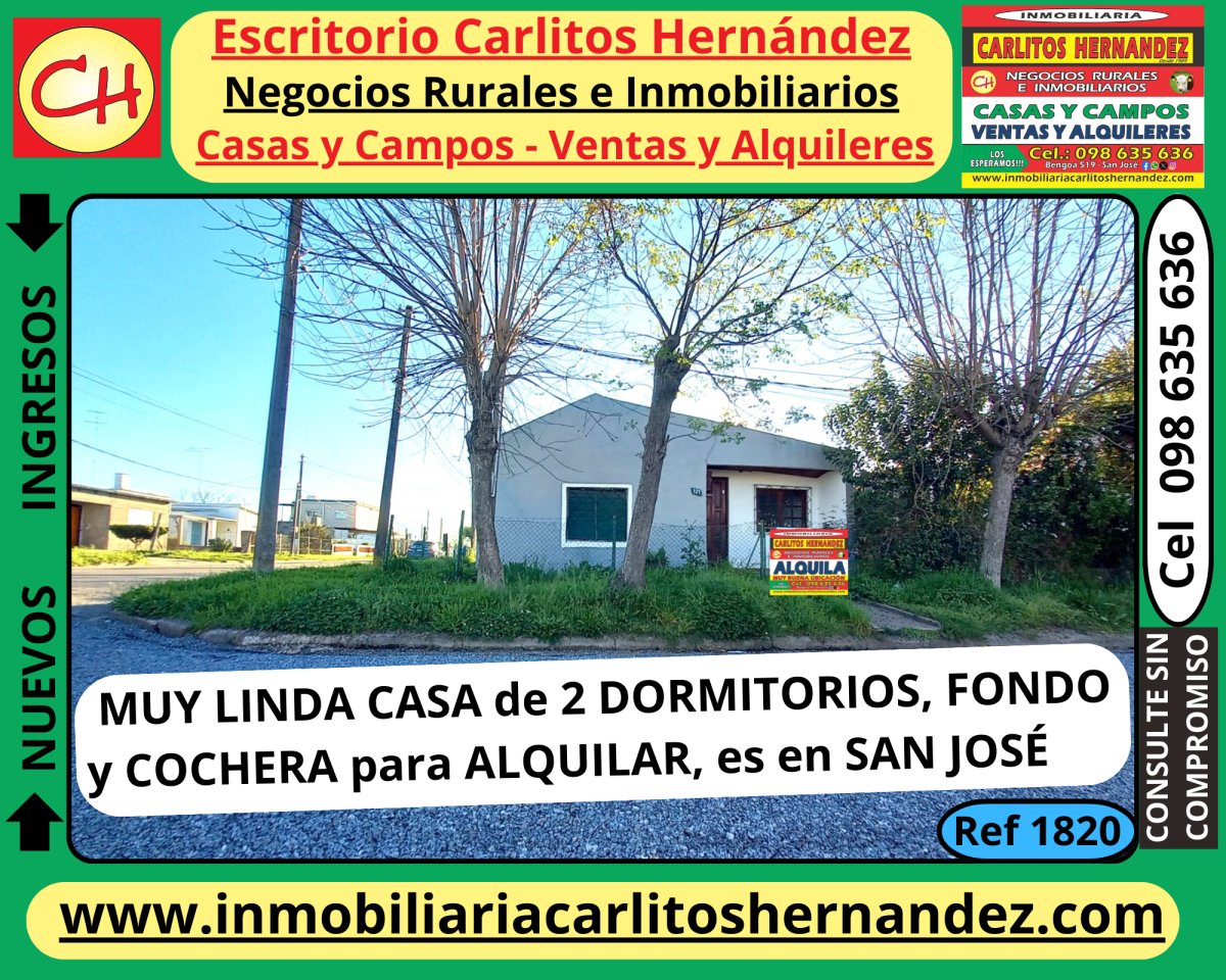 Ref 1820) A - 🏘🏘 MUY LINDA CASA de 2 DORMITORIOS 🛏🛏 , FONDO 😺🐶 y COCHERA 🚘🚘 , es para ALQUILAR 💲 💲, en SAN JOSÉ 👈 👈