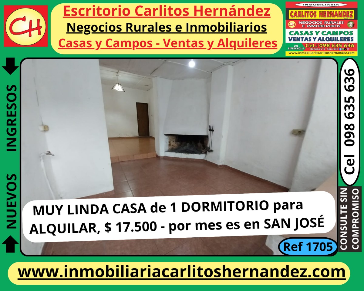 Ref 1705) A - 🏘🏘 MUY LINDA CASA CÉNTRICA de 1 DORMITORIO 🛌 para ALQUILAR, 💲 💲 es en SAN JOSÉ 👈 👈