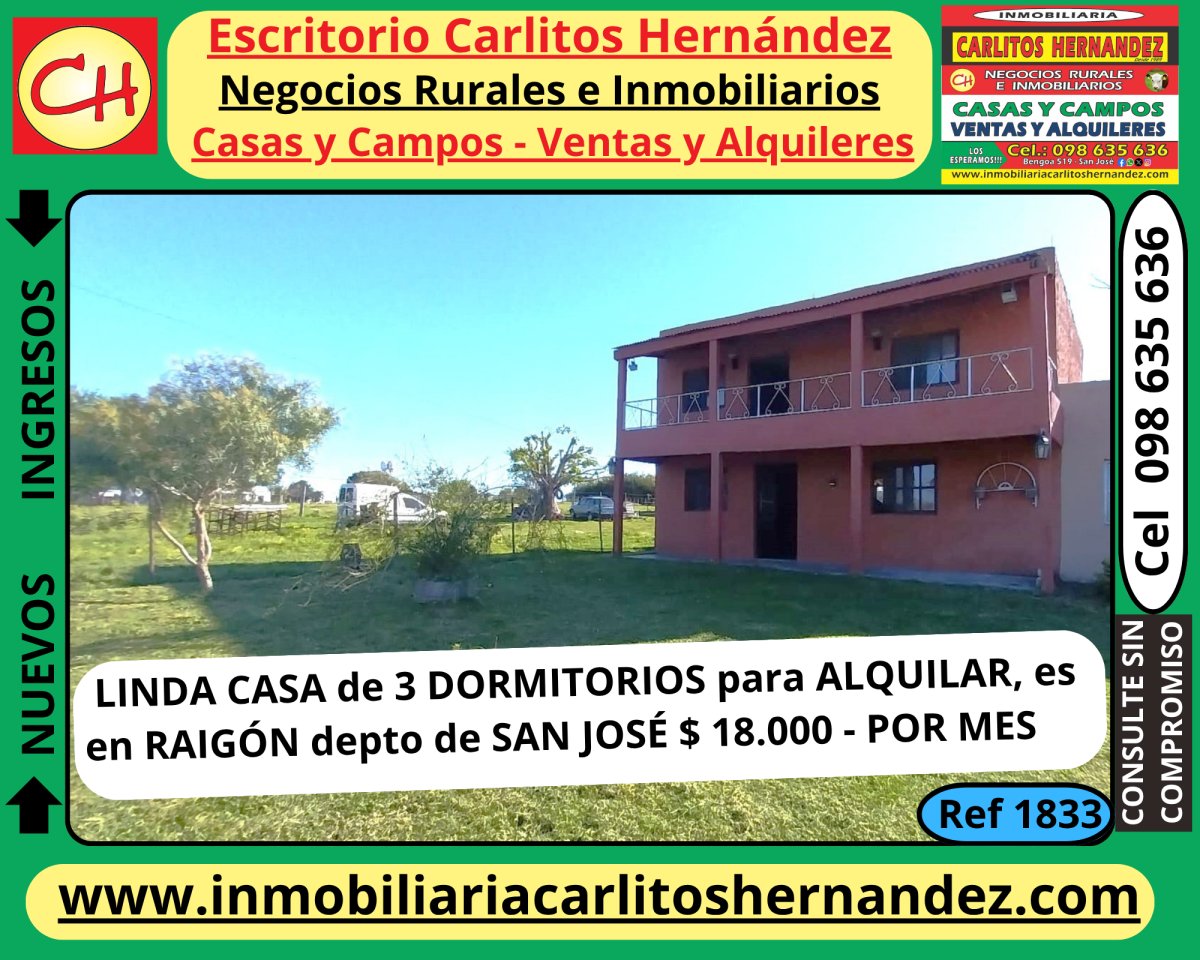 Ref 1833) A - 🏘🏘 MUY LINDA CASA de 3 DORMITORIOS 🛏🛏🛏para ALQUILAR, 💲 💲 es en RAIGÓN DEPARTAMENTO de SAN JOSÉ 👈 👈