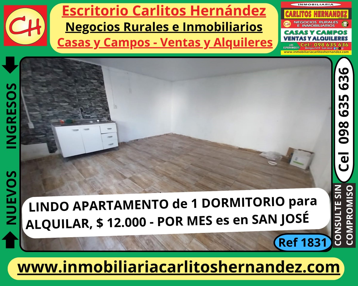 Ref 1831) A - 🏘🏘 MUY LINDO APARTAMENTO de 1 DORMITORIO 🛏 para ALQUILAR , 💲 💲 es en SAN JOSÉ 👈 👈