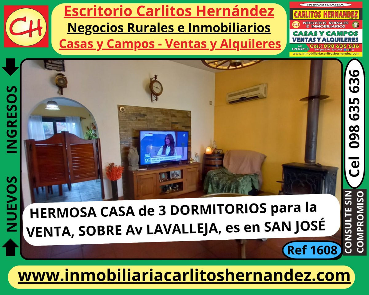 Ref 1608) V - 🏘 🏘 HERMOSA CASA DE 3 DORMITORIOS, 🛏 🛏 🛏 FONDO 😺🐶 Y COCHERA 🚘 🚘 PARA LA " VENTA, " 💲 💲 ‼️ ‼️ MUY BUENA UBICACIÓN SOBRE AVENIDA LAVALLEJA ‼️ ‼️ EN SAN JOSÉ 👈👈