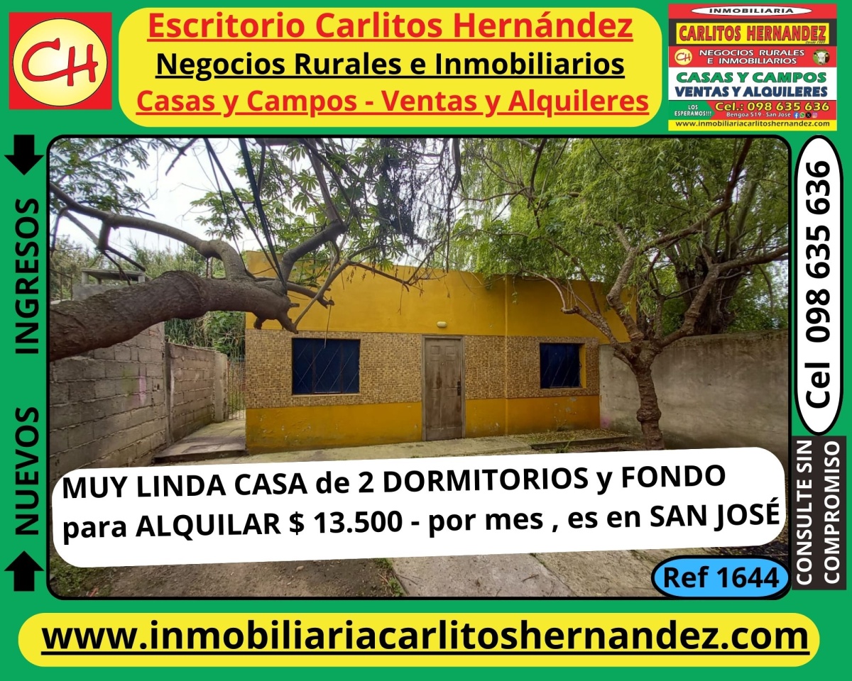 Ref 1644) A - 🏠🏠 MUY LINDA CASA de 2 DORMITORIOS 🛏 🛏 y FONDO para ALQUILAR, 💲 💲 es en SAN JOSÉ 👈👈