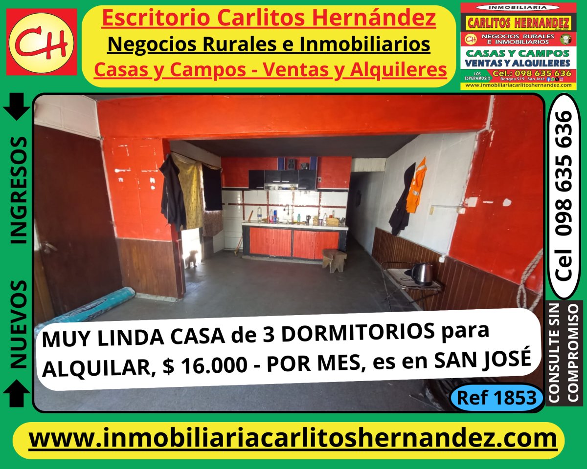 Ref 1853) A - 🏘🏘 MUY LINDA CASA de 3 DORMITORIOS 🛏 🛏🛏 para ALQUILAR, 💲 💲 es en SAN JOSÉ 👈👈